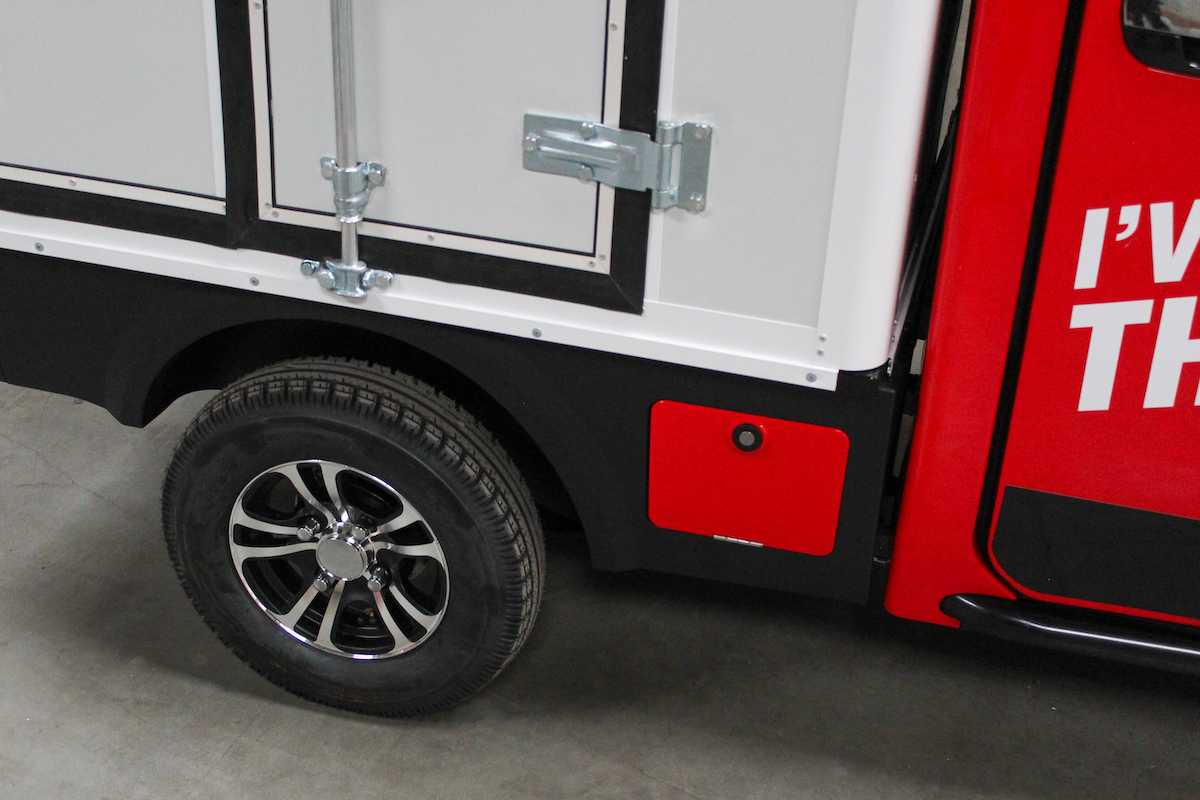 Den bagmonterede transportboks (L: 1300, B: 1000, H: 1150 mm) giver rigeligt med opbevaringsplads. Den elektriske motor på 3 kW og 70Ah batteri giver op til 75 km rækkevidde på en opladning – selv med fyldt last.